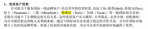 2019年半年报中,世运电路表示,公司致力于服务国际一线品牌客户,经过多年的经营积累,沉淀了如:捷普(Jabil)、伟创力(Flex)、松下(Panasonic)、三菱(Mitsubishi)、特斯拉(Tesla)、矢崎(Yazaki)等一批国际知名企业,并跟公司建立了长期稳定的互信关系,这些优质客户实力雄厚、订单稳定、定价合理、结账准时,为公司提供稳定的收入及利润来源。