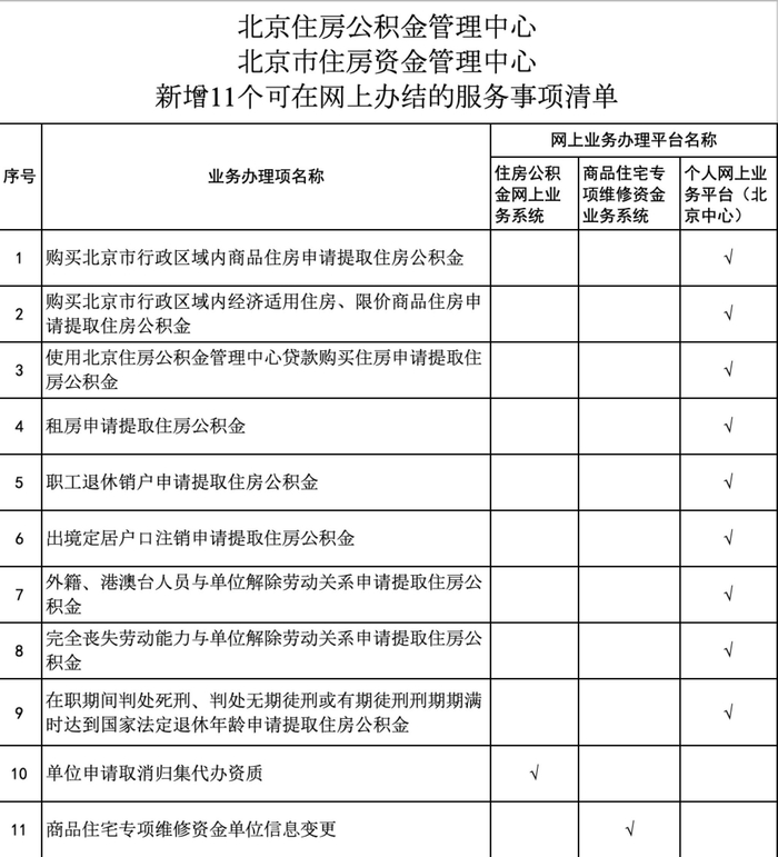 新增的11个可在网上办结的服务事项清单。图/北京住房公积金管理中心官网