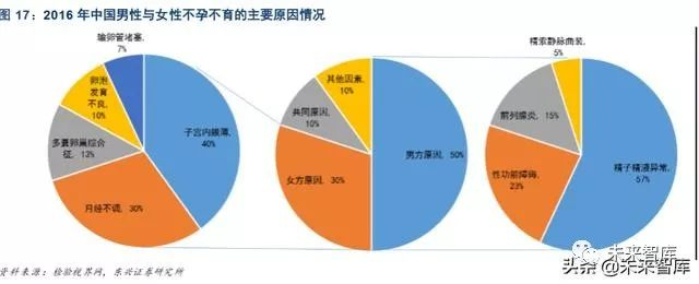不孕夫妇中,男方不育的因素占比为 50%,生育年龄推迟、内分泌失调、人工流产年轻化为女性不孕的 主要诱因。分析不孕不育症原因来看,50%的发病原因是男方导致,30%的原因是由女方导致,男女双 方共同的原因占比为 10%。导致男性不育的原因主要有 4 类,其中,精子精液异常占比 57%、性功能 障碍占比为 23%、前列腺炎占比为 15%;导致女性不孕的原因主要有 5 类,主要是因生育年龄推迟、 内分泌失调、人工流产年轻化引发的子宫内膜薄和月经不调。