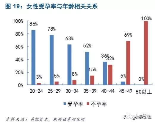 在 35 岁以后,女性生育能力明显下降。2010 年,中国女性的平均生育年龄推迟至 29.13 岁,比 2000 年提高 10.72%,且女性初婚、初育年龄持续提高。根据统计来看,女性受孕率与年龄呈现负相关关系, 35 岁以前,女性受孕率在 60%以上,不孕率在 8%或以下,在 35 岁-39 岁,不孕率提高至约15%,在40-44 岁,不孕率明显提高至约 32%,生育能力在 35 岁以后下降明显。
