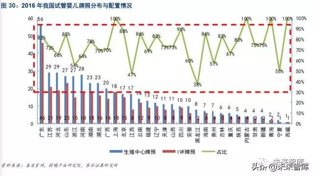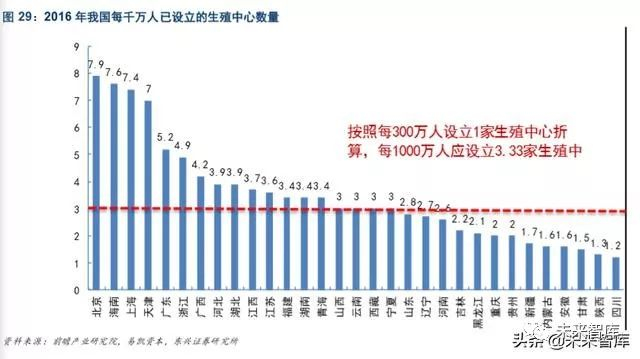 医疗资源丰富的地区生殖中心密度大,17 省市生殖中心配置未达要求。2015 年, 《人类辅助生殖技术 配置规划指导原则》提出,每 300 万人设立一家辅助生殖中心的规划。根据全国 31 个省市的生殖中心 密度来看,北京、海南、上海、天津的生殖中心数量仅为 17 家、7 家、18 家、11 家,但受益于当地医 疗资源丰富、人口密度高,每千万人拥有的生殖中心数分别为 7.9 家、7.6 家、7.4 家、7.0 家,密度远高于其它省份。另外,17 个省市地区的生殖中心密度没有达到规划指导,随着需求的释放,相关医疗机 构的配置数量将有效提升。