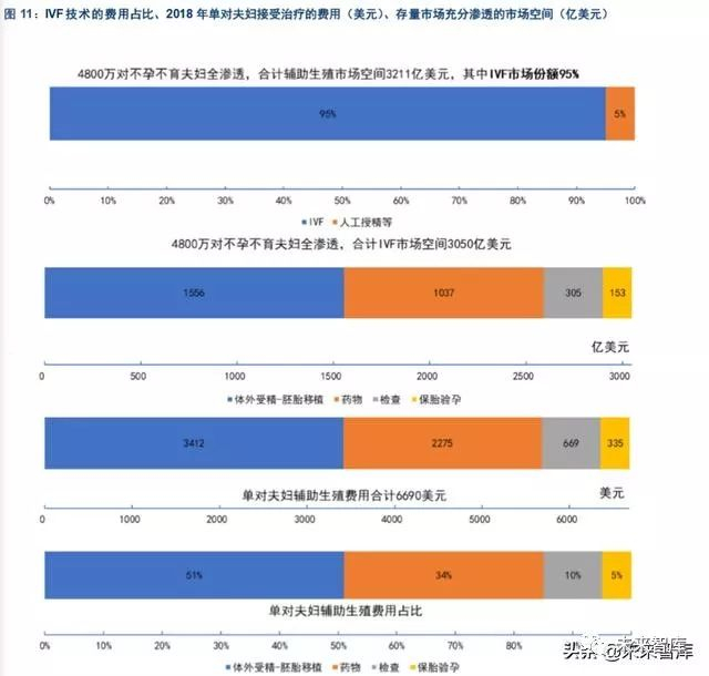 中国辅助生殖潜在市场空间达 3211 亿美元,IVF 市场规模占比达 95%。假设 4800 万对不孕不育夫妇 全部选择辅助生殖治疗,合计辅助市场空间达到 3211 亿美元,其中 2018 年 IVF 市场规模占比达95%, 则 IVF 合计市场空间达到约 3050 亿美元。IVF 治疗流程主要包含,从初诊建档至保胎验孕的总计约 12 个治疗步骤,其中,治疗费用主要分为 4 个部分,体外受精-胚胎移植(51%)、药物(34%)、检查(10%)、 保胎验孕(5%)。2018 年单对夫妇的医疗费用为 6690 美元,按照生殖技术的费用分布来看,体外受精 -胚胎移植费用为 3412 美元、药物费用为 2275 美元、检查费用为 669 美元、保胎验孕费用为 335 美元。