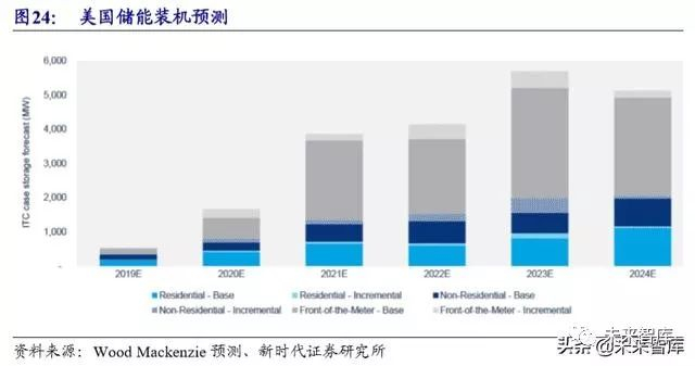 独立储能 ITC 政策有望出台。当前,美国业界正在促使美国政府出台针对储 能的投资税抵免政策(ITC)。据 Wood Mackenzie 预计,如果独立的储能 ITC 政策 出台,到 2024 年每年储能新增装机量将达到 5.1GW,较基准预测值 4.8GW 增加 300MW/年。