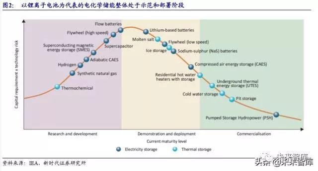 不同储能技术成熟度与成本差异较大。抽水蓄能目前商业化应用最为成熟,作 为调峰、调频和备用电源广泛应用于电网侧,主要优点是技术成熟度高、功率和容 量较大、成本低,但主要缺点在于受地形制约较大、能量密度较低、总投资较高、 投资回收期较长等。以锂离子电池为代表的电化学储能整体处于示范和部署阶段, 成本仍具备较大下降空间。合成天然气、氢能、压缩空气储能、超导储能、超级电 容储能、飞轮储能等仍处于研发阶段。