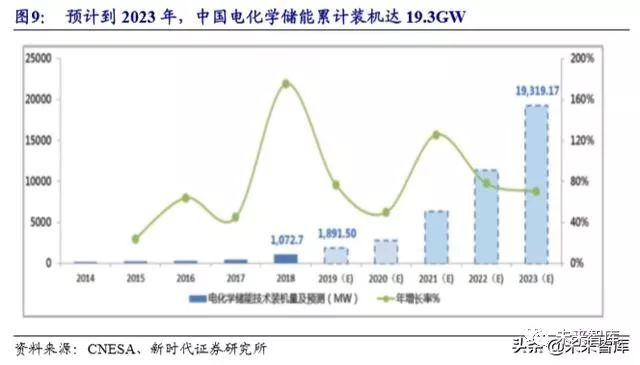 储能与新能源配套存在较大的发展空间。目前,西部地区仍然存在消纳问题。2019 年前三季度,风电、光伏弃电量分别为 128.3、32.5 亿 kWh,主要集中在西部 地区。但在中东部地区,新能源的消纳开始出现边际的变化,目前安徽、山东等地 区已经开始鼓励风电、光伏项目自行配备适当比例的储能。按照中长期中国每年100GW 以上新增光伏风电装机计算,假设按 10%的容量配臵储能,每年可带来 10GW 以上新增储能。