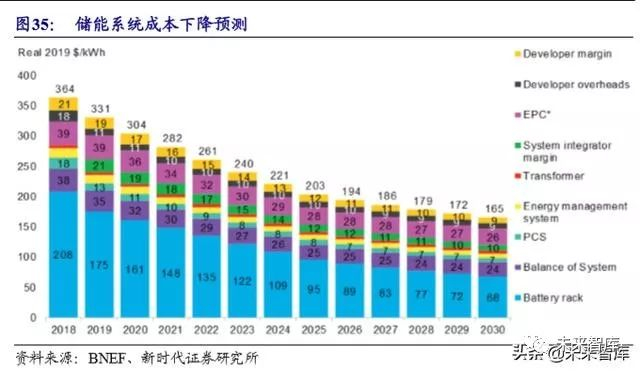 据 BNEF 预计,2018 年储能系统成本为 364 美元/kWh,到 2030 年,储能系统 成本有望降至 165 美元/kWh。而考虑循环寿命的提升,储能的度电成本下降更快。据宁德时代计算,到 2020 年储能的度电成本(LCOE)有望降至 0.25 元/KWh 以下, 电化学储能在不需要任何补贴的情况下已经初步具备经济性。
