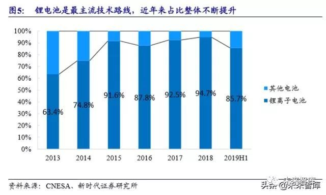 锂电池是最主流电化学储能技术路线。各类电化学储能技术中,锂离子电池累 计规模最大,是最主流的电化学储能技术路线。根据 CNESA 数据,截至 2018 年 底,全球锂电池储能累计装机 5.71GW,占电化学储能累计装机的 86.3%。锂电池 在储能的应用上,以磷酸铁锂电池为主流。