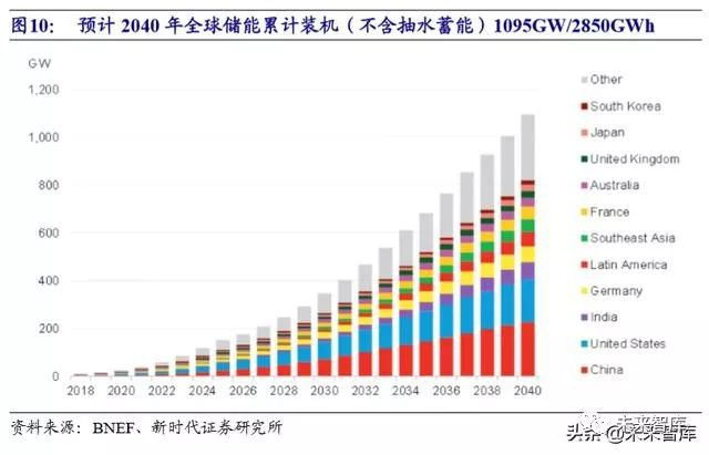 据 CNESA 预测,到 2019 年底,中国电化学储能累计装机 1.89GW,2020 年 底累计装机 2.83GW,到 2023 年底累计装机 19.3GW。根据 BNEF 的预测,到 2040 年,全球储能累计装机(不含抽水蓄能)将达到近 1095GW/2850GWh,对应投资 6620 亿美元。我们认为,抽水蓄能以外的电力储能,特别是容量型储能,未来将 以电化学储能为主。
