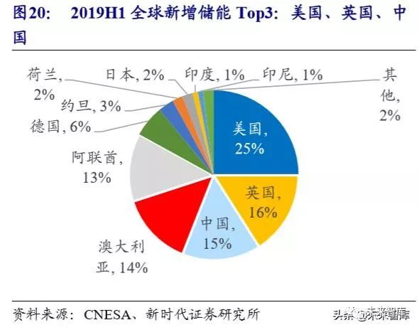 根据 CNESA 数据,2019 年上半年,全球新投运电化学储能项目 802.1MW, 同比下降 38.9%。其中,排名前五的国家为美国(197.1MW)、英国(126.7MW)、 中国(116.9MW)、澳大利亚(116.2MW)、阿联酋(108MW)等。相比而言,海 外市场由于电力市场化更加成熟,储能的应用更广,随着成本的快速下降,未来将 是储能市场增长的主要贡献力量。储能企业近期也在海外接连斩获大单,如宁德时 代与 Powin Energy 签订 1.85GWh 储能电芯供货合同、阳光电源功签约马萨诸塞州 15MW/32MWh 储能项目。国内在电网侧储能由于政策原因快速下滑的背景下,短 期内从量的增速看,可能不会十分乐观,但随着政策成熟、电力市场化改革推进、 商业模式探索完善以及成本下降,国内储能市场终将发展成熟,未来前景十分乐观。