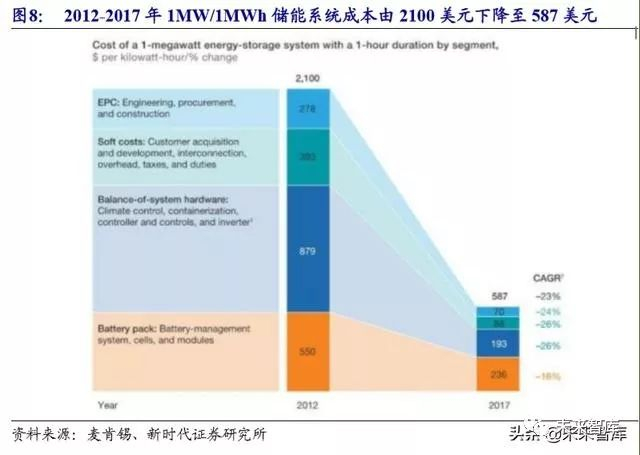 系统成本不断下降,储能经济性拐点开始出现。除电池成本外,由 BMS(电 池管理系统)、PCS(储能变流器)和施工成本构成的 BOS 成本也在快速下降。根 据麦肯锡数据,2012 年至 2017 年,储能系统中电池以外的成本(BOS 成本)由 1500 美元/MWh 下降至 351 美元/MWh,平均每年降幅超过 25%。