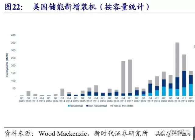 截至 2018 年底,美国储能总并网量达 23GW(含抽水蓄能),其中电化学储能 并网量达 1GW,占比 4.3%。美国储能分为三类:户用储能、非户用储能(工商业) 和电表前储能(发电和输配电侧),其中电表前储能占比较高,户用储能整体呈稳 定增长趋势。