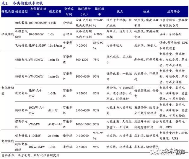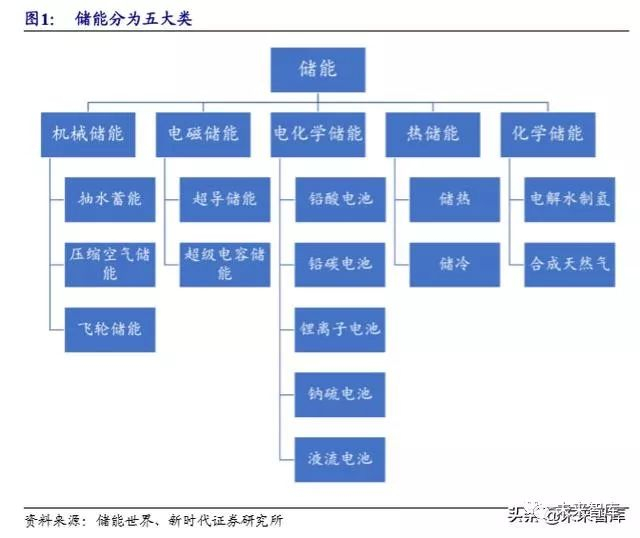 储能即能量的存储。指通过特定的装臵或物理介质将能量存储起来以便在需要 时利用。根据能量存储方式的不同,储能可以分为机械储能、电气储能、电化学储 能、热储能和化学储能五大类。从能量释放的方式看,除热储能外,大部分储能最 终以电能形式释放。