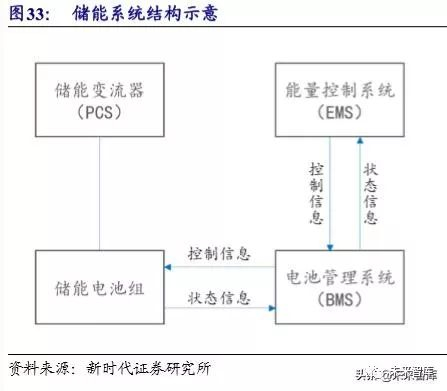 电化学储能系统主要由电池(锂电池或其他电池)、电池管理系统(BMS)、 储 能变流器(PCS) 、能量管理系统(EMS)及其他电气设备构成。电池是储能系统 的最重要的构成部分。电池管理系统(BMS)主要负责电池的监测、评估、保护和 均衡监测。储能变流器(PCS)负责直流和交流的相互转换。能量管理系统(EMS) 负责数据采集、网络监控、能量调度等。