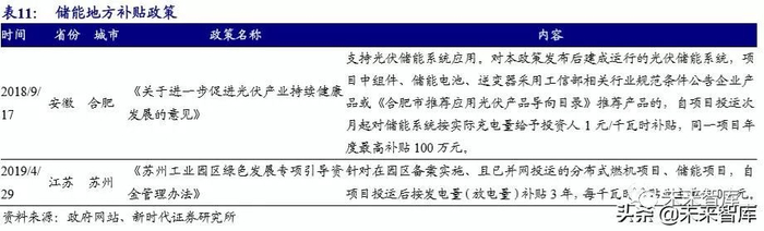 部分省市开始出台补贴政策。目前针对储能出台补贴政策的有合肥和苏州。合 肥政策针对符合政策的光伏储能系统,按储能实际充电量给予 1 元/kWh 的补贴。苏州针对工业园区的储能项目,按放电量补贴 3 年,补贴标准 0.3 元/kWh。