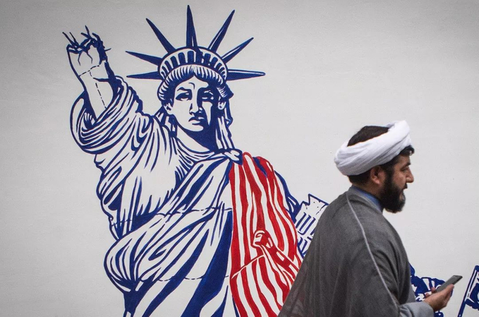 行人从伊朗首都德黑兰街头的反美宣传画前走过