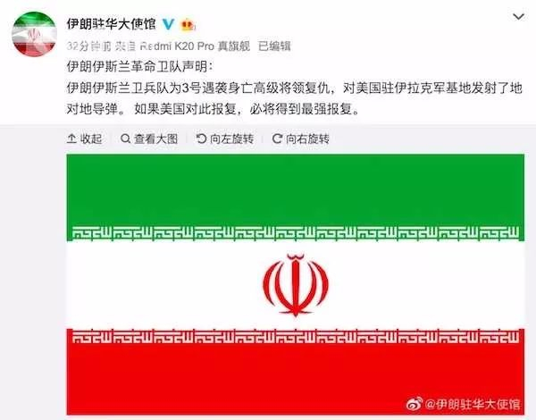 伊朗革命卫队在国家电视台发表声明称:“如果美国对这些袭击做出回应,将会有更大规模的袭击发生。这不是威胁,而是警告。”后半段句式,反用了特朗普元旦针对伊朗的激烈话语。