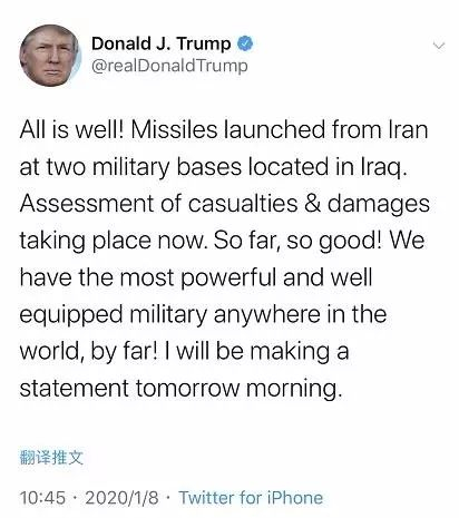 特朗普发推回应伊朗导弹袭击:“一切都还好!伊朗向我们在伊拉克的基地发射了数枚导弹,目前伤亡和损失评估正在进行中。截至目前,情况还可以!不论在世界任何地方,我们都有战力最强、装备最先进的军队!明早,我将发表一份声明。”