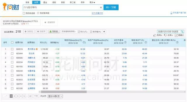 简便一点,大家可以利用起“i问财”这个工具,比如输入“白马股有哪些”,它就会帮你筛选出一些股票来。