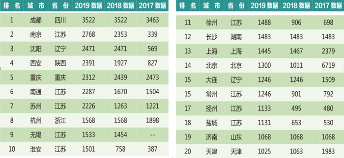 2019年城市书店数量排行榜TOP20。