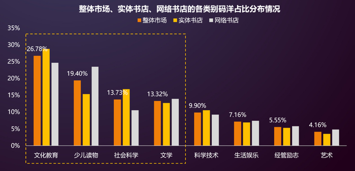文教、少儿、社科、文学四大类销售码洋占73.23%。