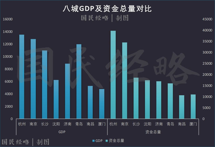 在资金总量上,仍旧是杭州和南京遥遥领先,都是3万亿以上的量级,与其他城市拉开较大差距。