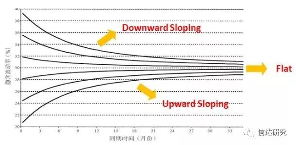 这个判别预期有三种状态,一是当曲线处于水平状态,说明全市场预期短期和中长期的标的风险度或者不确定性是差不多的;二是向上倾斜的曲线,说明全市场短期波澜不惊,而中长期的风险度较高,一般是有某项不确定事件兑现而导致波动率的高估;三是向下倾斜的曲线,说明短期市场出现意外的风险或不确定事件,而中长期则相对平稳。
