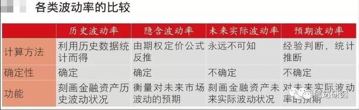 举个“栗子”:比如一年四季又要入冬了,天气自然会逐步的寒冷起来,温度随时会下降,那么到底今年几月份会比较寒冷呢?11月?还是12月?我们会参考多种因素,首先我们肯定是回想一下过去几年甚至更长时间中,在几月份天气大概率会比较寒冷,根据过去几年的历史数据得到的对未来的预期,这就是“历史波动率”,光看历史数据,我们依然不足以证明什么,于是我们会打开我们的手机,看看天气预报,天气预报预期今天或者某个时间段天气会冷起来,这种预期出来的,对未来市场波动率的预期就是“预期波动率”,通过上述的过程,可能还是不能完全推断出结果,于是我们推开窗户看看户外人群们的衣着,我们发现户外的人群全部都是羽绒服出门,这种信息就更为直观有效,由参与人群各方带来的信息,也就是由参与者共同预期的波动率就是“隐含波动率”,隐含波动率就是参与者行为所反推出的,我们参考了上述三个指标了之后,到了我们出门感受温度的那一刻,天气到底是不是寒冷,就叫做“实际波动率”。(备注:波动率指数则是有每个合约的隐含波动率编制而成)