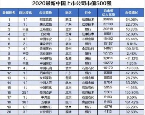 中国上市公司市值500强榜单 海康领先百度!(附榜单)
