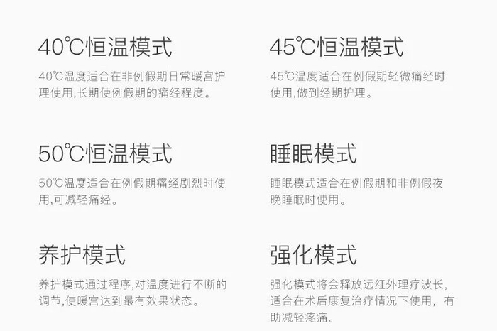 50℃恒温档适合姨妈期间,剧烈痛时配合强化模式,帮助暖宫,一定程度上缓解痛经。