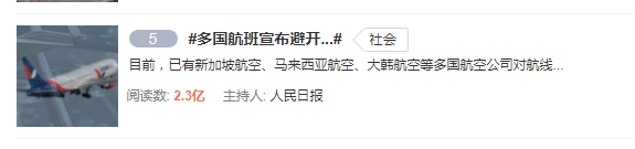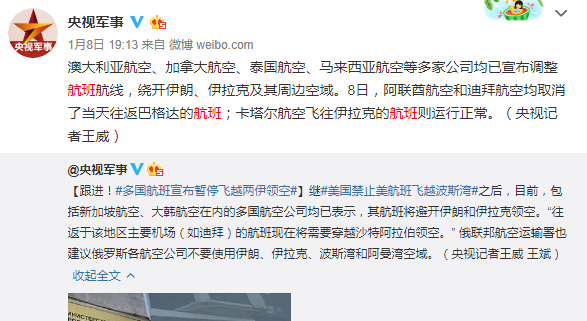 今天(1月9日),“多国航班宣布避开两伊领空”登上了微博热搜第5位。