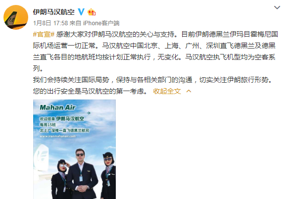 1月8日,伊朗马汉航空发布了一条声明称,“目前伊朗德黑兰伊玛目霍梅尼国际机场运营一切正常。马汉航空中国北京、上海、广州、深圳直飞德黑兰及德黑兰直飞各目的地航班均按计划正常执行,无变化。马汉航空执飞机型均为空客系列。”