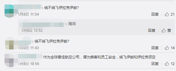 1月8日晚,南航取消了乌鲁木齐飞往伊朗德黑兰的航班。阿联酋航空和迪拜航空均取消了当天往返伊拉克巴格达的航班。目前,已有新加坡航空、马来西亚航空、大韩航空等多国航空公司对航线进行调整,避开伊朗和伊拉克领空。