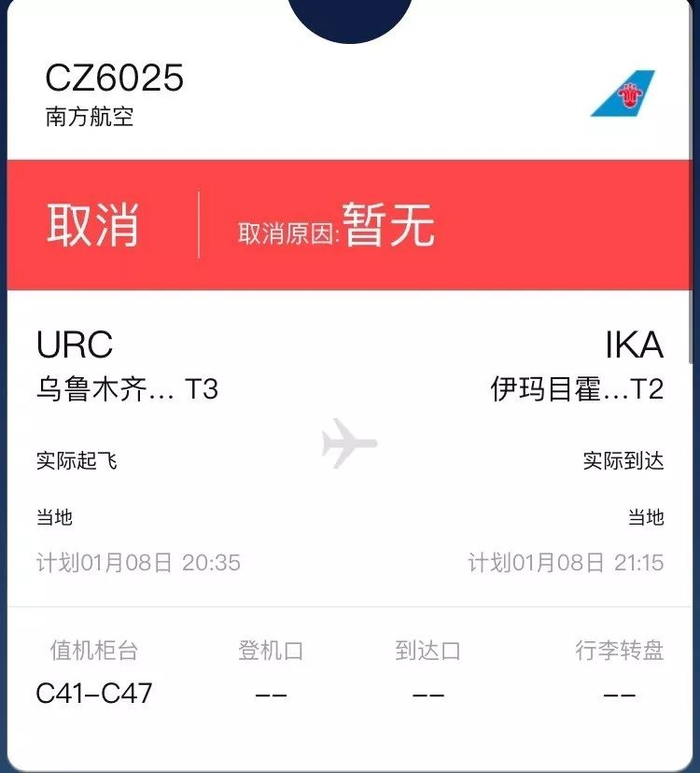 南航CZ6026航班原计划22:35从德黑兰起飞次日凌晨抵达乌鲁木齐地窝堡机场T3,提示“取消预警”。