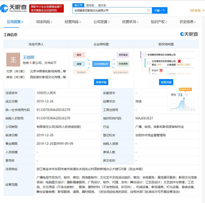 天眼查数据显示,2019年12月26日,爱奇艺注册成立新公司——东阳爱奇艺影视文化有限公司。