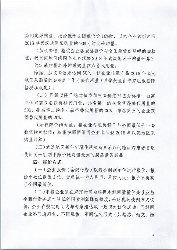 《通知》显示,此次带量议价的胰岛素类药品品种范围为2019年6月30日前在“湖北省药械集中采购服务平台”挂网且在武汉地区医疗机构有交易量的人胰岛素及胰岛素类似物药品。