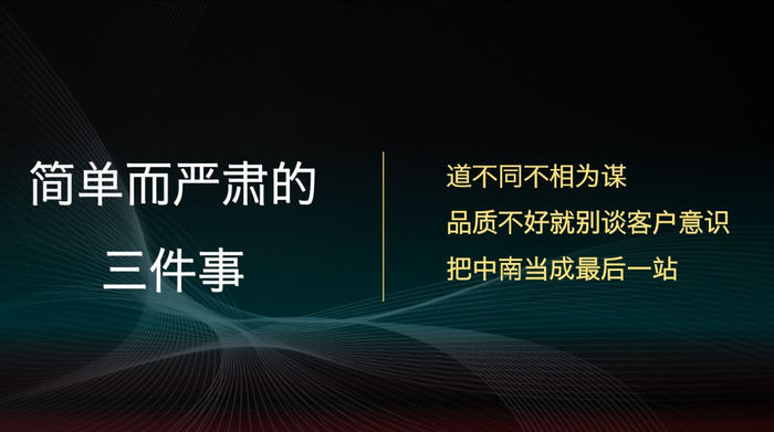 品质不好就别谈客户意识。道理很简单,却常被忽视。我们必须明确,品质是客户意识中最基本的要求,是不能被取舍的刚性底线。当下最重要的还是把兑现我们对客户的基本品质承诺变成一种“集体无意识”,集团各职能条线和各战区都要深入思考,如何把品质文化打造成中南的集体文化?这个命题,后续我要跟集团人力一起推动深究。