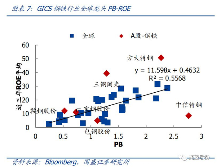 对于估值水平判断:根据全球各周期行业龙头,计算A股龙头估值与盈利匹配偏离度,偏离度越大,估值吸引力越强。具体方法是:选取某个行业全球市值前30龙头作为样本,计算其ROE和PB的线性拟合曲线;A股选取各行业市值前六作为行业龙头,根据线性拟合曲线和A股龙头的ROE和PB计算得到A股龙头距离直线的距离,定义为龙头估值与盈利匹配的偏离度,向上偏离度越大,说明估值吸引力越强。