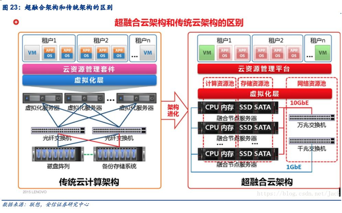 超融合是私有云的产物。超融合技术是一种以软件为中心的架构,在一个通常由x86硬件组成的系统里集合计算、存储和虚拟化资源。超融合架构也能够作为一个独立售卖的软件,安装在客户已有的硬件上。根据IDC对超融合的定义,节点间没有明确的计算和存储的分工,在同一个服务器硬件资源(目前主要是x86服务器)上实现核心的存储和计算功能,封装为单一的、高度虚拟化的解决方案。