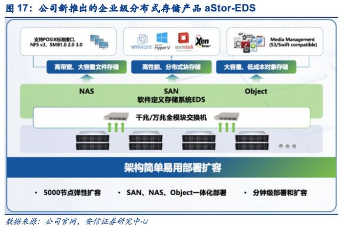 面向云计算领域推出企业级分布式存储产品。2019年1月,公司推出了新的云计算产品——企业级分布式存储aStor-EDS。AStor-EDS采取软件定义统一存储系统,采用全对称分布式架构,支持数千节点集群部署,支持EB级存储空间、1000万IOPS高性能支撑,内置AI智能云脑技术,可感知业务数据,实现数据的全生命周期管理。真正实现了一个平台全面支撑块、文件、对象存储。以解决传统架构存储面临维护成本过高,扩展困难,生命周期短以及海量数据处理效率低、数据孤岛等问题。