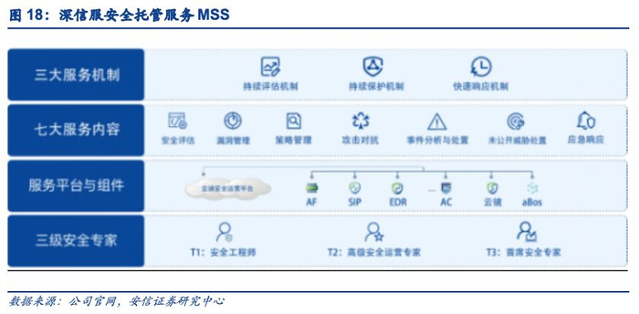 利用人工智能,发布安全托管服务MSS(Managed Security Services,安全托管服务)。深信服MSS整合了专家的安全经验以及人工智能的优势,通过安全运营平台的7*24小时监测,帮助用户持续评估风险;用户可避免传统的人力托管服务不及时以及人员能力参差不齐所造成的风险。