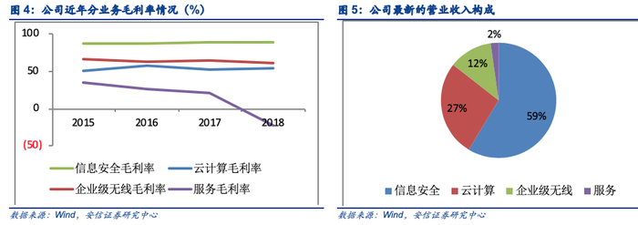 主营业务由信息安全、云计算及企业级无线构成。公司是国内信息安全行业的龙头企业,在上网行为管理、SSLVPN、下一代防火墙等多个领域都具备领先优势。公司的云计算产品入选Gartner x86服务器虚拟化架构魔力象限,获得权威评估机构的认可。