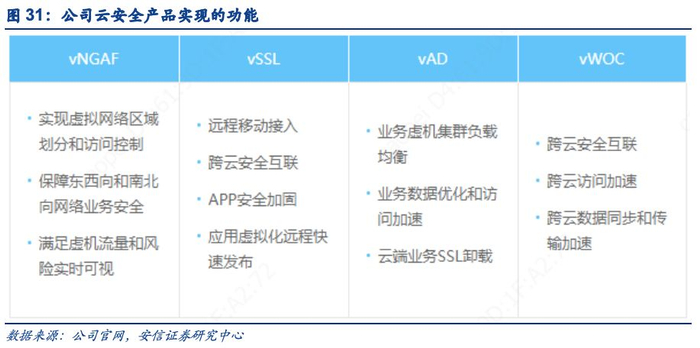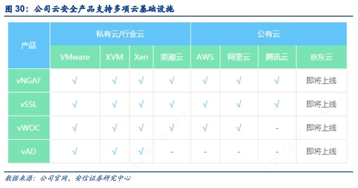 云安全,伴随信息安全架构的新产品。云计算催生了新一代的架构,对于安全的需求亦发生了改变,整体安全的重心迁移到了平台安全需求上,包括分区分域需求、云应用安全需求、防止漏洞攻击需求等。此外用户端的虚拟化安全需求,包括虚拟化WEB安全需求、访问控制等。公司提供了下一代防火墙(vAF经纬系列)、SSL VPN(vSSL)、应用交付(vAD)、广域网优化(vWOC)等产品,用户可在阿里云、AWS、腾讯云等公有云平台按需选配vSSL、vNGAF等云安全防护资源。