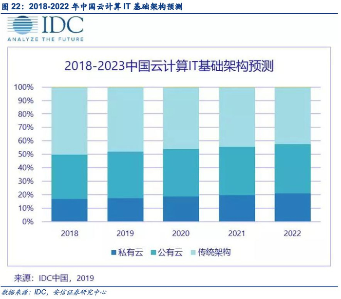 与全球不同的是,中国的私有云基础架构市场高速增长。根据IDC的统计,2018年中国公共和私有云IT基础架构的投资总计120.1亿美元,同比增长74.7%。IDC预计,2019年中国云IT基础架构的总投资将达到151.7亿美元,同比增长25.5%。私有云同时保持了高速的增长,2018年私有云相关支出增长49.2%,达到38亿美元。中国云IT基础架构支出的增长速度远高于全球。无论公有云还是私有云,相应IT基础架构支出在中国的增长速度都是全球增速的两倍左右。