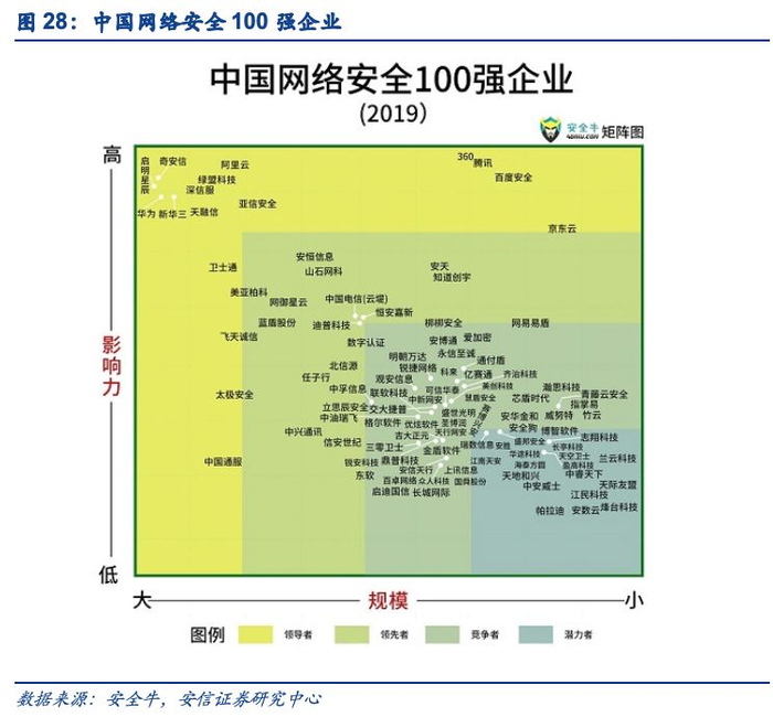 公司处于网络安全领先者阵列。根据安全牛最新发布的《中国网络安全100强企业》的报告,2018年网络安全行业收入总额约为529.46亿元,同比增长32%。公司与启明星辰、奇安信、华为以及新华三位于第一阵列。