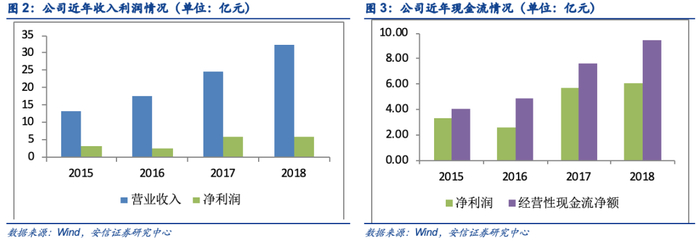 营业收入、净利润及经营性现金流净额保持快速增长。公司2015-2018年的营业收入分别为13.19亿元、17.50亿元、24.72亿元、32.24亿元;净利润分别为3.30亿元、2.58亿元、5.73亿元、6.03亿元;2015-2018年的经营性现金流净额分别为4.03亿、4.87亿、7.65亿、9.43亿元,历年经营性现金流净额均高于净利润。
