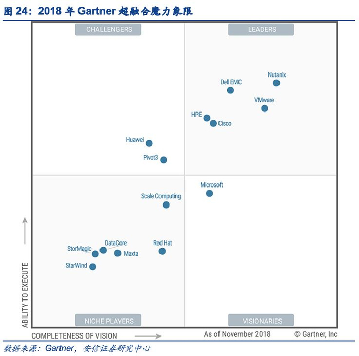 全球范围来看,超融合市场由大企业主导。从超融合的发展历史来看,超融合技术最初由一些初创企业推动,例如Maxta, Nutanix, Pivot3, Scale Computing等,其中Nutanix是超融合的概念提出者。随着超融合市场的成熟,一些大型企业例如Cisco、Dell、 EMC、Vmware、联想和Netapp也在逐步进入。根据2018年Gartner的超融合魔力象限,Nutanix、Dell、EMC、Vmware、HPE和Cisco处于领导者象限,其中Nutanix、Vmware提供的是软件解决方案,Dell、Emc、HPE以及Cisco提供的则是一体化解决方案。