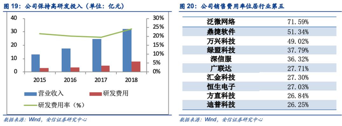 出色的产品表现背后,是卓越的研发销售配合。作为一家产品型企业,公司长期在研发上保持高投入,近四年的研发费用率均在20%左右。2018年公司销售费用率为36%,在中信计算机行业排名第五。公司高度重视渠道关系,目前和公司建立深度合作关系的渠道伙伴近两千家。