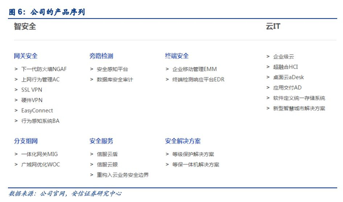公司成立于2000年,第一款信息安全产品IPSec VPN于2002年发布,2008年起市场占有率持续保持第一。公司随后推出了多款产品,包括上网行为管理、广域网优化、防火墙等。