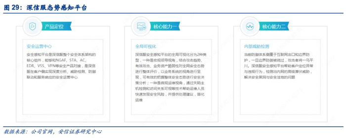 态势感知有望成为新的信息安全增长点。态势感知平台定位为客户的安全大脑,是一个检测、预警、响应处置的大数据安全分析平台。其以全流量分析为核心,结合威胁情报、行为分析建模、UEBA、失陷主机检测、图关联分析、机器学习、大数据关联分析、可视化等技术,对全网流量实现全网业务可视化、威胁可视化、攻击与可疑流量可视化等,帮助客户在高级威胁入侵之后,损失发生之前及时发现威胁。