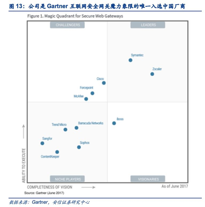 上网行为管理产品排名第一并入选Gartner魔力象限。公司于2005年推出上网行为管理软件,2009年取得市场份额第一,自此之后连续9年排名第一。根据IDC的数据,2017年其市场份额为27.5%,超过第二、三、四名总和。自2011年以来,一直是唯一入围Gartner SWG《 Magic Quadrant for Secure Web Gateways (互联网安全网关魔力象限) 》的国内厂商。